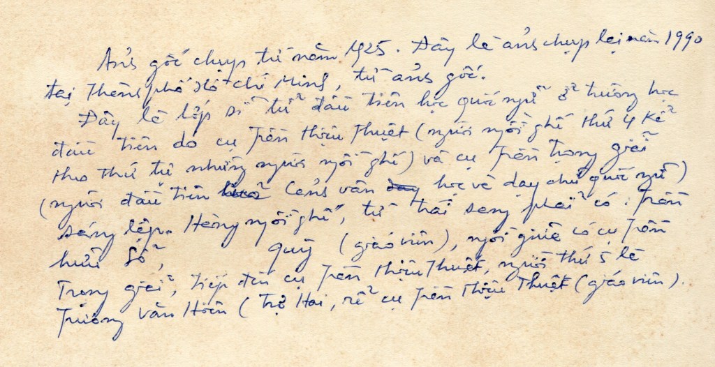 “Thượng tuần tháng 11 (Đinh Mão 1927, Bán Đại nhị niên) anh ta TRẦN THIỆU THUẬT và ta diện tiếp hai cha con ông Chủ Mỹ Á ra thăm, ở lại đây một ngày một đêm. Ta vẫn chưa tìm được Chi phái thứ 3. Sau này các con cháu ta tiếp tục, nên thận trọng (nguyên văn: Ngô điệt nhi đa thận chi)”.